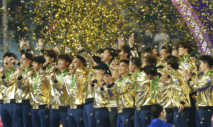 2025年湘超决赛,永州队1比0投诚常德队捧起冠军奖杯(新华社)