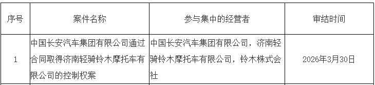 【大河财立方音讯】4月13日,商场监管总局公布无条目批准运筹帷幄者连合案件列表,其中包括中国长安汽车集团有限公司通过合同获得济南轻骑铃木摩托车有限公司的界限权案。