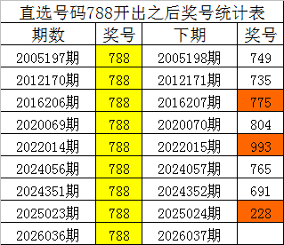 从上表统计不错看出,直选号码788开出之后,其下期奖号: