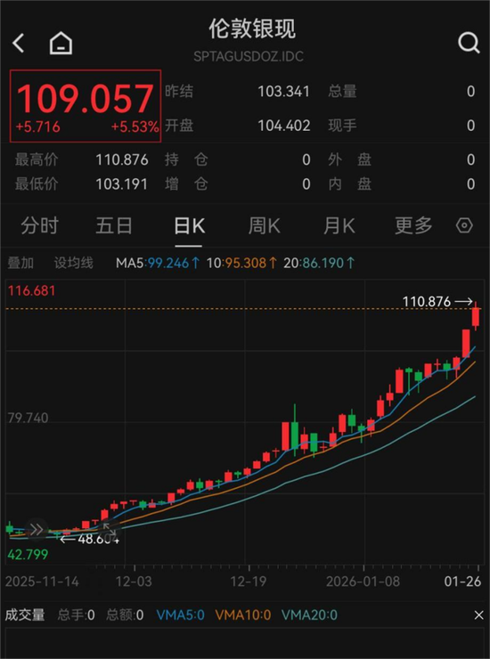 1月26日,白银价格仍在走高,现货、期货一度双双站上110美元/盎司。截至发稿,COMEX白银报109.505美元/盎司,涨幅超8%;伦敦银报109.057美元/盎司,涨幅超5.5%。