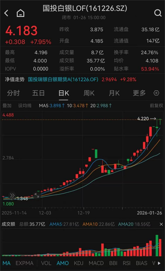 国投白银LOF溢价率也持续高企。截至1月26日收盘,二级市场报4.183元,溢价率超53%。