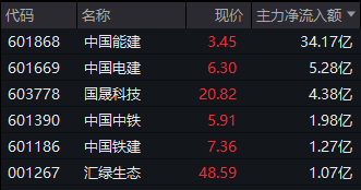 个股方面,中国能建取得逾34亿元主力资金净流入,中国电建、国晟科技(维权)、中国中铁、中国铁建等也取得超亿元净流入。